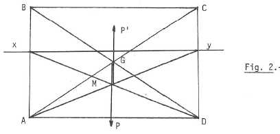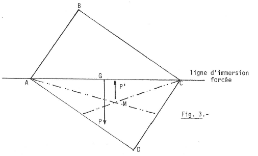 Le corps est enfoncé de 6cm, jusqu’à la ligne de flottaison xy et la poussée P’ s’exerce au point M, point de rencontre des diagonales rectangle AxyD (fig. 2).