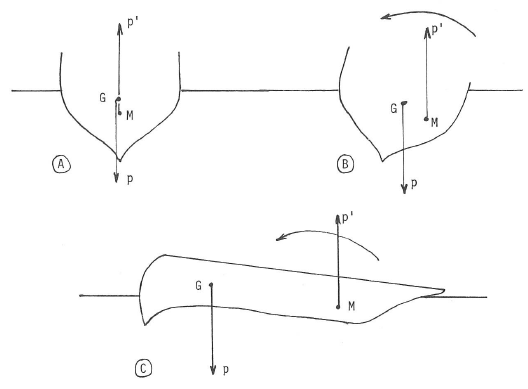 Quand le bateau penche d’un côté, la figure B montre que la poussée p’ tend à le redresser.