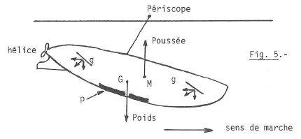 La plongée est obtenue grâce à des gouvernails de profondeur g, mobiles ; quand le sous-marin avance, si les gouvernails sont inclinés vers l’avant et vers le bas, la résistance de l’eau sur leur face supérieure fait enfoncer le sous-marin ; en manœuvrant les gouvernails g on peut à volonté faire descendre ou monter le sous-marin (fig. 5).