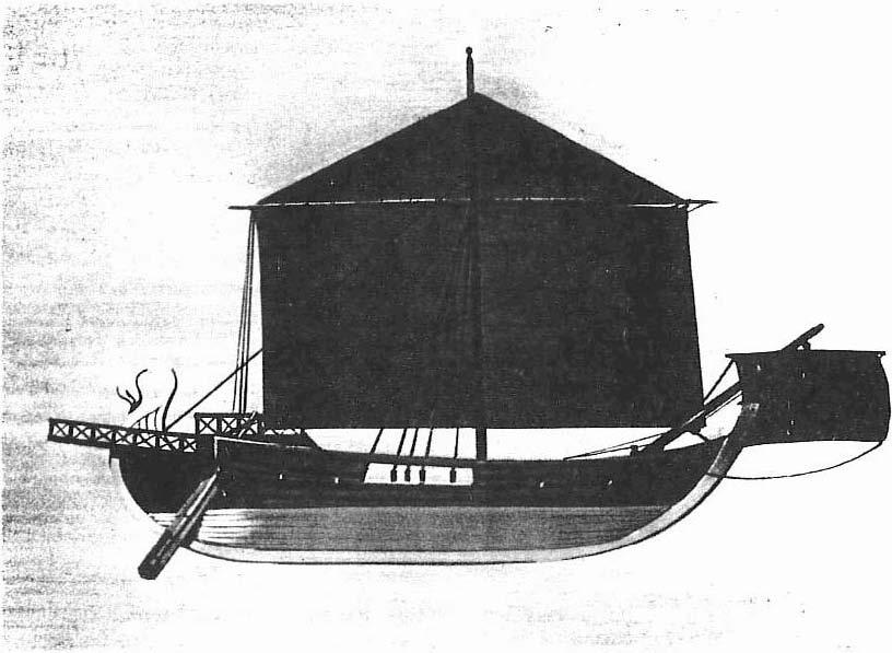 La voile était carrée, tendue sur 2 vergues et ils étaient dirigés par un aviron de gouverne formé d’une rame à large pelle.
