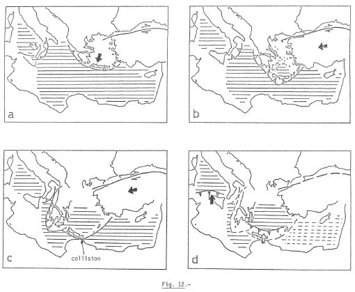 La figure 12 nous montre en « a » la situation de la Méditerranée il y a une dizaine de millions en « b » la situation actuelle. L’arc s’est sur la Méditerranée orientale en même temps que la croûte océanique continue à s’enfoncer sous l’Europe vers le Nord. En « c » on voit ce qui pourrait se passer dans 5 millions d’années. L’arc pourrait continuer à s’agrandir, finissant par fermer le bassin Ionien. Il se produirait alors une collision.