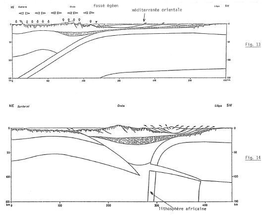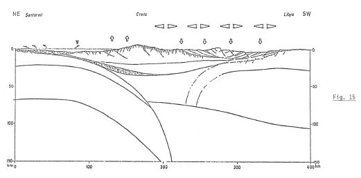 En coupe (fig. 13) on peut observer la croûte de la Libye puis la Méditerranée orientale, puis le fossé égéen et la crète avec le volcanisme, et le bassin du Santorin. Ce système pourrait de la façon suivante (fig. 14) : la Méditerranée orientale se fermerait. Il y aurait une situation de collision. Toute la lithosphère africaine disparaîtrait en profondeur sous l’Europe. A l’arrière une nouvelle subduction pourrait se produire (fi g. 15). Les restes de la Méditerranée orientale serait une chaîne de montagne.