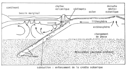 Là où les plaques lithosphériques plongent dans le manteau, des fosses océaniques se creusent. Des séismes se produisent essentiellement dans la partie supérieure des plaques descendantes. Les flèches situées dans l’asthénosphère indiquent la direction des mouvements convectifs possibles. Des mouvements convectifs secondaires peuvent provoquer la formation de petits centres d’expansion sous les bassins marginaux.
