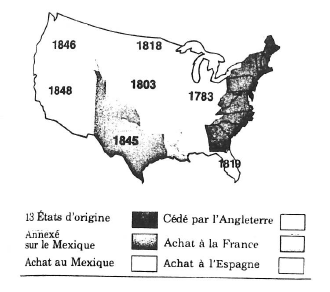 A partir de 1840, une faille apparut. Les U.S.A. se composaient des 13 premières colonies : les territoires de l’Ouest compris entre les 13 colonies et le Mississipi, c’est-à-dire à l’Ouest des Appalaches, cédés par les Anglais en 1883, la Floride achetée à l’Espagne en 1810, la Louisiane (région située entre le Mississipi et les montagnes rocheuses). Le reste appartenait au Mexique, pays aussi vaste et peuplé que les U.S.A.