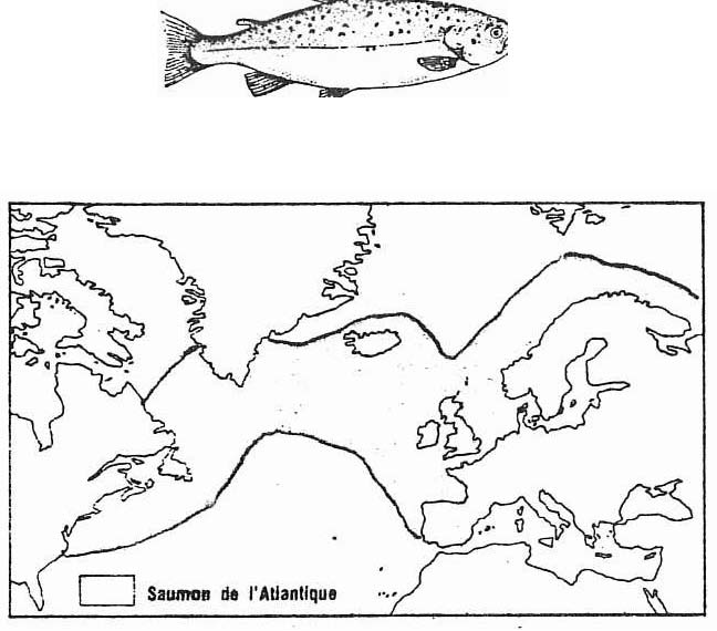 - le jeune Saumon, né dans un fleuve d’Europe, se laisse emporter par le courant dans la mer où il se nourrit pendant la plus grande partie de sa vie adulte ; lorsqu’il est prêt à se reproduire, il revient dans le fleuve côtier, souvent dans l’affluent où il est né ; l’aller et le retour sont donc le fait d’un même animal : fig. 1.