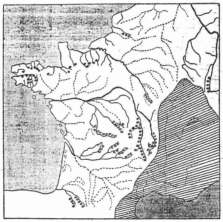 Carte de montée et de ponte du Saumon en France. L’espace en hachures marque le versant Méditerranéen, où l’espèce n’existe pas. Les cours d’eau en traits pleins sont ceux où a lieu une montée ou un essai de montée ; les cours d’eau en pointillé sont ceux où le Saumon n’a point de montée régulière. Les cercles noirs marquent les emplacements actuels des frayères encore fréquentées ; les cercles blancs indiquent la place des frayères actuellement inactives.