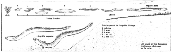 Dans les eaux douces, elles deviennent des anguilles jaunes qui, au bout de dix à quinze ans, se transforment en Anguilles argentées pourvues d’yeux énormes. Elles redescendent alors les rivières, en direction de la mer des Sargasses où elles pondent et meurent. Cette migration de retour n’a pas été démontrée formellement pour l’anguille d’Europe.