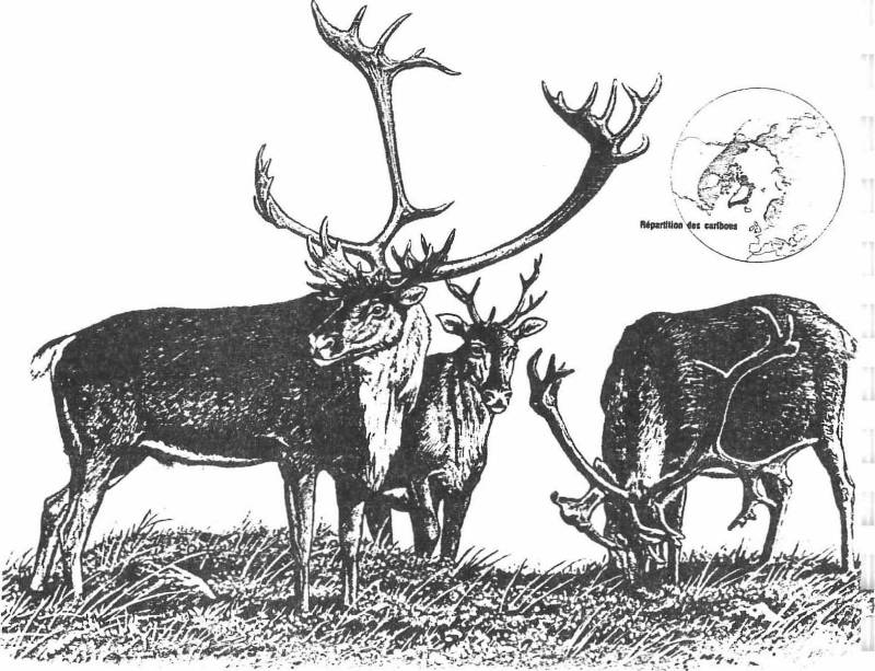 Les Caribous, Rangifer tarandus, vivent en petits groupes de 100 individus au maximum ou en vastes troupeaux comptant jusqu’à 100 000 têtes. Les Caribous sont la seule espèce de cervidés où les mâles et femelles portent des bois. Leurs sabots très larges leur assurent une meilleure prise sur la neige et la glace.