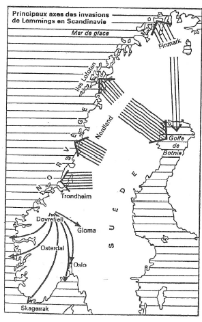 Il existe douze espèces de Lemmings que l’on rencontre dans le Nord de l’Europe, de l’Asie et de l’Amérique du Nord. Le plus grand, qui le Lemming des toundras, Lemmus lemmes, est celui qui figure dans la plupart des récits de migrations massives. Ces migrations se produisent au cours des pullulations qui sont probablement dues au fait que la femelle peut avoir plusieurs portées de trois à neuf petits chaque année. L’époque à laquelle survient cette explosion démographique est peut-être liée au climat. Si l’été est exceptionnellement long, la nourriture sera abondante et les conditions plus propices à la reproduction. Si les hivers ne sont ni assez doux ni assez rigoureux, il est probable que la population sera plus importante l’été suivant. Lorsque ces deux conditions sont réunies, il y a risque de pullulation.