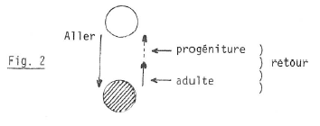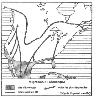 - le papillon Monarque, chaque année, quitte l’Amérique du Nord, se dirige vers le Sud et hiberne en bordure du golfe du Mexique. Au printemps les Papillons remontent vers le Nord, s’accouplent en cours de route, pondent, mais n’atteignent pas le point de départ. La dernière étape du voyage est effectuée par leur progéniture ; deux générations sont nécessaires pour fermer le cycle : fig. 2.
