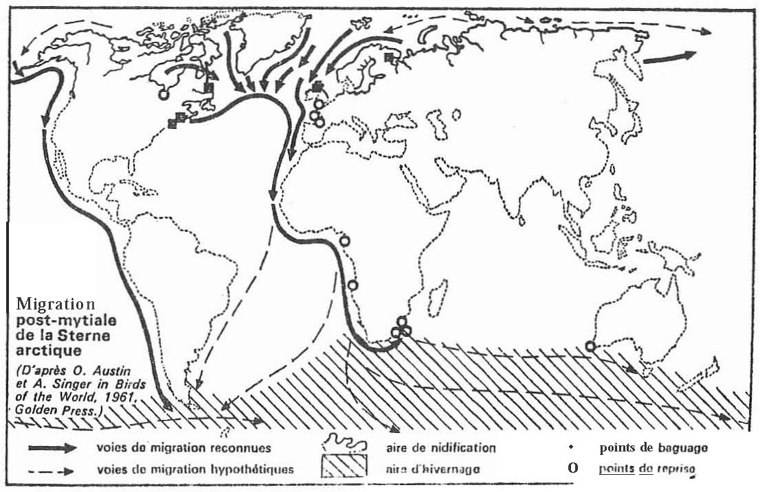 La Sterne arctique détient le record de distance de migration. Elle niche le long des côtes les plus septentrionales de l’Europe, de l’Asie et de l’Amérique, hiverne dans les secteurs antarctiques de l’Atlantique et du Pacifique, en bordure des glaces flottantes.