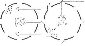 En mettant des Étourneaux dans une volière expérimentale où il pouvait modifier, au moyen de miroirs, la position du soleil perçue par ces oiseaux, Gustav Kramer a montré que ceux-ci utilisaient l’astre pour déterminer leur direction de migration. Les Étourneaux se déplaçaient de manière à conserver le mème angle par rapport au soleil, qu’ils en reçoivent directement les rayons (1) ou que ces rayons soient réfléchis par les miroirs (2). Lorsque le soleil était caché par d’épais nuages ou lorsque l’on couvrait les fenêtres de la volière de papier translucide, les oiseaux étaient désorientés.