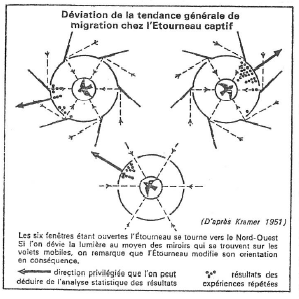 Au début des années 1950, Gustav Kramer, un ornithologue allemand, observa les Étourneaux placés dans de petites cages. Tous battaient des ailes dans la même direction si le soleil était visible.
