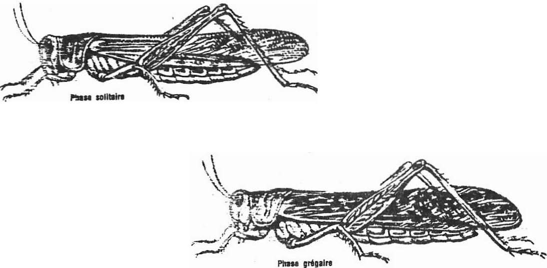 Le Criquet grégaire présente deux phases ou formes, l’une grégaire et l’autre solitaire, qui diffèrent par leur coloration, leur forme, leur taille et leur comportement. Dans les lieux où la végétation est clairsemée, les jeunes larves sont jaune ou orange taché de noir. Elles deviennent des adultes jaunes marqués de noir, ayant de longues ailes et un petit corps, qui migrent de jour en nuages groupant des millions d’individus. Là où la végétation est riche, adultes et larves sont verts. Cette autre phase migre de nuit, et solitairement.