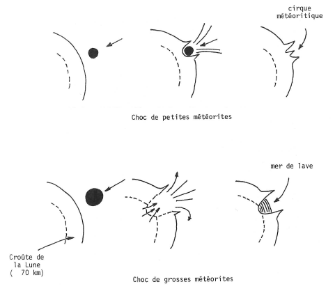 Les plus grands dépassent 200 km de diamètre ; mais les plus petits discernables de la Terre n’excèdent pas le kilomètre. Ils seraient dûs à des impacts de météorites. Il en existe également sur la Terre (fig. 8).