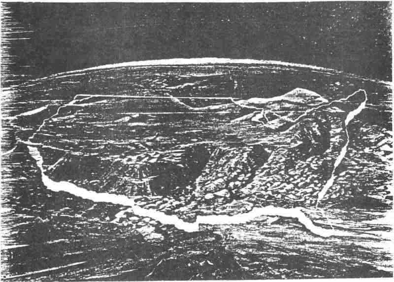 Ce dessin réalisé d’après les données obtenues par le radar-altimètre porté à bord de la sonde américaine Pioneer-Vénus 1 montre l’un des deux grands massifs montagneux s’élevant au-dessus de la plaine vénusienne : Terra Ishbar.