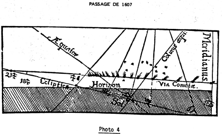 La réapparition la plus spectaculaire fut celle de 1910 (photo 6). En mai 1910, la Terre passa dans la queue de la Comète, ce qui provoqua de grandes inquiétudes, à cause de la présence d’un gaz toxique, le cyanogène, dans l’atmosphère de la comète. Mais on avait évidemment surestimé la densité de la queue de la comète, donc sa toxicité. La tête de la Comète est prolongée par une longue queue brillante faite de poussières et d’ions diffusant la lumière du soleil. Une deuxième queue plus irrégulière surmontant la première est constituée de nuages d’ions entrainés par le vent solaire.