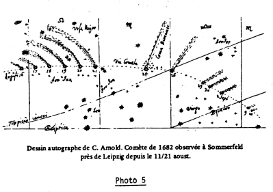 La Comète de Halley a retenu l’attention de l’humanité près de 3000 ans : on retrouve dans plusieurs écrits la trace de ses passages. Le passage d’avril 1066 immortalisé sur la célèbre tapisserie de Bayeux (photo 1) fut considéré comme un présage de la victoire de Guillaume le Conquérant la bataille de Hastings. En 1301, Giotto, troublé par la comète, la représente dans son « Adoration des Mages » (photo 2). Une gravure nous montre le passage de la comète en 1531 (photo 3). En 1682 (photos 4,5) Edmond Halley alors âgé de 26 ans, astronome et mathématicien, collaborateur de Newton, fut fasciné par le mouvement des planètes. En 1705, il publie un mémoire dans lequel il explique que les comètes observées en 1456, 1531, 1607 et enfin celle qu’il observa lui-même en 1682, ne sont en réalité qui une seule et même comète.