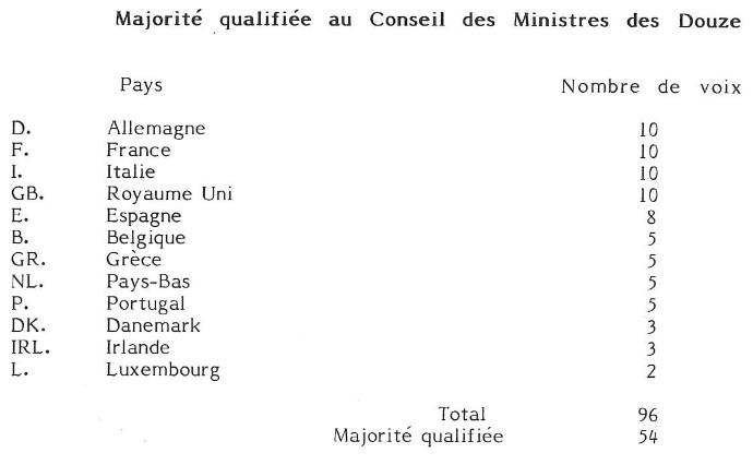Il comprend les 12 Ministres homologues de chaque pays. Les décisions, en principe, sont prises à une majorité qui s’impose à l’ensemble des participants. L’application est difficile. Bien que la règle majoritaire figure dans les traités, elle est remise en cause pour tout ce qui est important. C’est la France qui, la première, a bloqué les décisions en 1965 en pratiquant la « politique de la chaise vide » pendant 6 mois, donc en usant de son droit de veto.