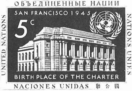 Timbre commémoratif de la signature de la Charte de l’Organisation des Nations à San Francisco, le 26 juin représentant le Memorial Opera House, où eut lieu la cérémonie, et portant l’emblème des Nations Unies. |
