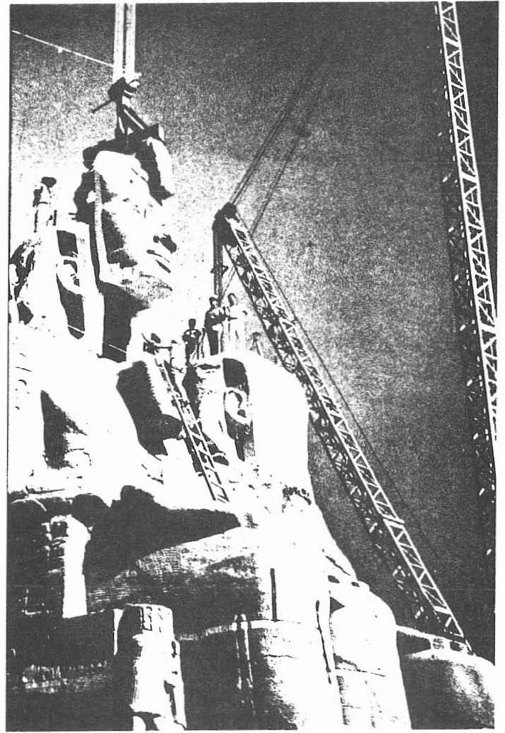 La construction du Haut-barrage, en vue d’augmenter la surface des terres arables et la production d’électricité, devait encore surélever le niveau des eaux du NIL au sud d’Assouan et jusqu’à la cataracte de Dal au Soudan, et entraîner la formation d’un lac immense, situé à 183 mètres au-dessus de la mer qui engloutirait à jamais tous les aspects de vie contemporaine ou anciens. Cette perspective incita le Gouvernement égyptien à l’U.N.E.S.C.O. de lancer un appel international pour sauver l’ensemble du patrimoine nubien. Il fut décidé de démonter les temples pierre par pierre et de les remonter sur l’île voisine d’Agilkia. |