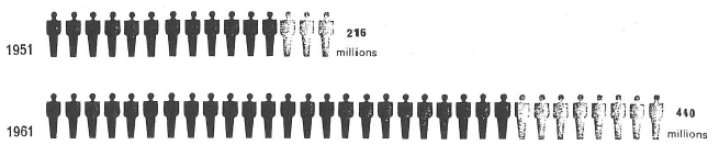 En 1951 80% d’une population de 216 millions d’êtres étaient illettrés (en noir). En 1961, bien que les illettrés ne soient plus que 76%, la population ayant doublé, ce total s’est accru.