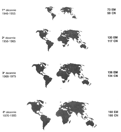 IV. – Évolution du nombre d’États membres (E.M.) et du nombre des Commissions nationales (C.N.) par décennie, de 1946 à 1985.