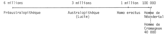 Une notion difficile à concevoir est celle du temps. Quinze milliards d’années se sont écoulées depuis l’explosion originelle, 5 milliards depuis la formation du système solaire, 4 milliards 600 millions depuis la formation de la Terre, 3 milliards 700 millions depuis la constitution de l’océan primitif, 3 milliards 200 millions depuis les premières colonies d’algues bleues, 500 millions depuis les premiers vertébrés, 345 millions d’années depuis la sortie des eaux, 170 millions d’années depuis les premiers mammifères, et peine 65 millions d’années depuis le premier primate et autour de 3 millions d’années depuis l’apparition des ancêtres de l’Homme.
