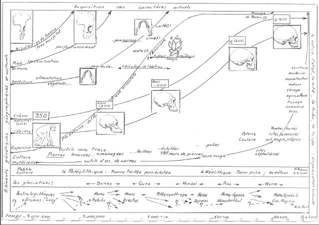 Vers 2,5 millions d’années, ces primates bipèdes, que l’on appelle Hominidés (donc pas encore « hommes »), acquièrent progressivement un cerveau qui dépasse 600 cc et pour la première fois Homohabilis, possède un langage et taille des outils, premiers témoignages de l’apparition de la pensée conceptuelle (photo 1).