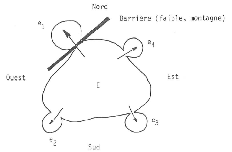 Au nord, viendront donc les sujets les mieux armés contre le froid. Il arrive qu’un groupe, lors d’un hiver pas très rigoureux, dépasse la frontière. Normalement ce groupe migre et va pouvoir rester en e1 et s’y reproduire. Si une frontière sépare ces deux niches écologiques e1 et E, par exemple une chaîne de montagnes, une faille, alors au bout d’un certain nombre de générations, e1 ne peut plus se croiser avec E. La divergence génétique est devenue trop grande. C’est ainsi que naissent des espèces nouvelles généralement donc en dehors des frontières.