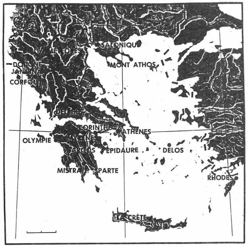 Géographie : La Grèce est en grande partie montagneuse, 68% du territoire a une altitude supérieure à 200 mètres. Un mont à 2218 m. est couvert de neige. Les reliefs arrivent presque toujours jusqu’à la mer et déterminent des côtes (15021 km) rocheuses, extrêmement articulées, riches en promontoires et en golfes. On compte 437 îles. Le peuple est un peuple de marins.