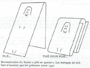 En 1453, le Suaire fut légué à Louis de Savoie. Les ducs de Savoie lui firent construire une chapelle à Chambéry. En 1532, un incendie éclata et fit rage autour du reliquaire d’argent où le Suaire était conservé. Le feu fit fondre en partie le métal. Une goutte d’argent en fusion tomba sur la toile pliée et la brûla en la traversant. On transporta le reliquaire embrasé au-dehors et on jeta dessus des seaux d’eau pour éteindre le feu.