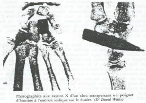 Un clou ne peut être enfoncé dans le poignet sans briser les os qu’en un seul point minuscule entre trois os, appelé « l’espace de Destot ». Cette ouverture n’a été décrite par les anatomistes qu’au XIXème siècle, mais elle semble avoir été connue des bourreaux des temps anciens. Le clou planté dans cette ouverture l’élargit et passe sans rien briser. Entouré d’os, il peut soutenir le poids du corps sur la croix.
