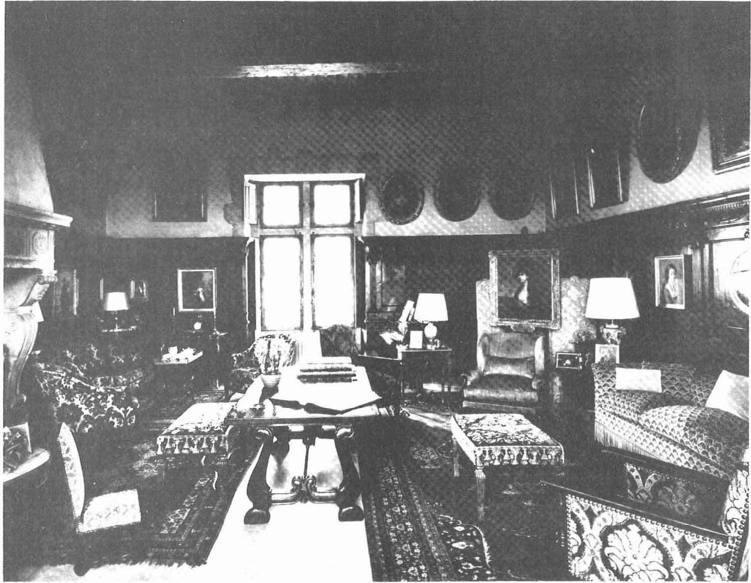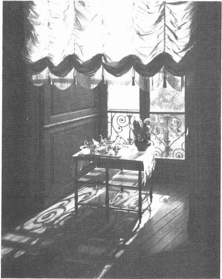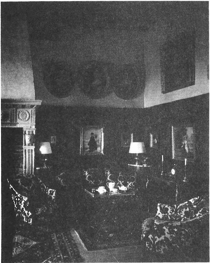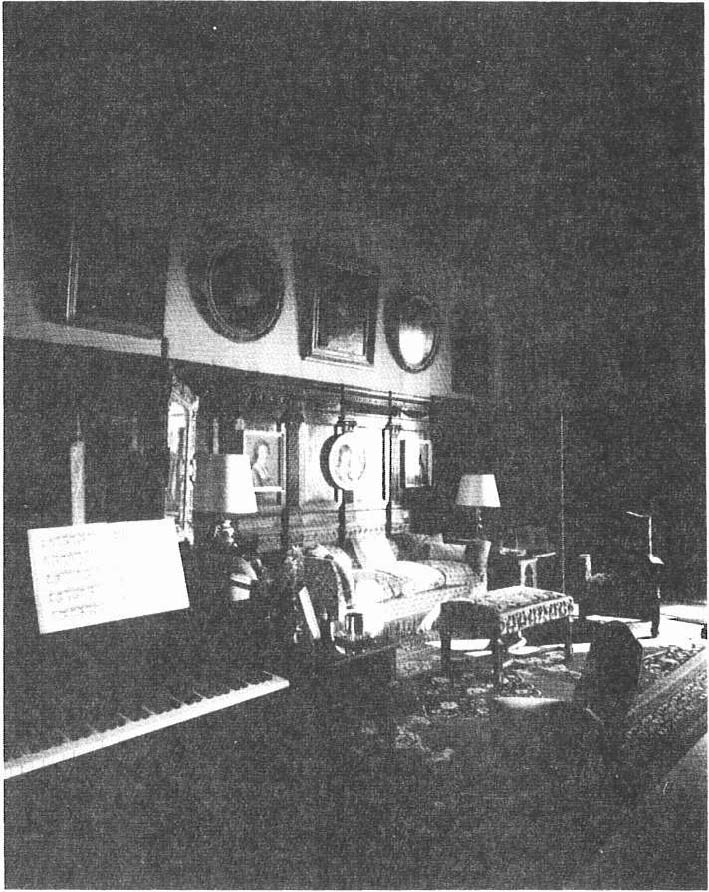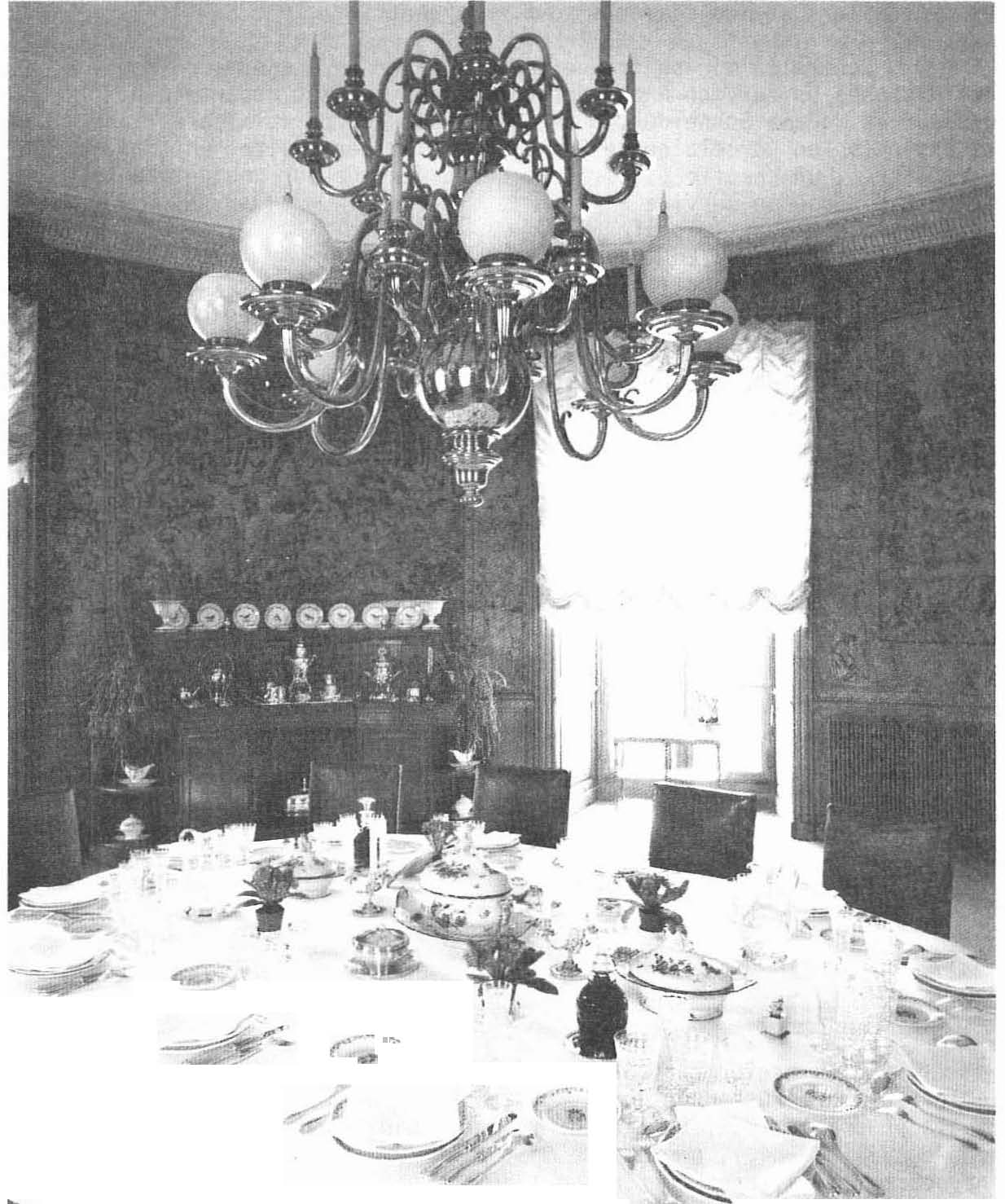 Contre un mur se trouve un vaisselier en acajou sur lequel sont disposés un service à thé en argent massif ayant appartenu à Monsieur et Madame Schneider, 6 petites tasses en porcelaine de Saxe, des assiettes en porcelaine de Paris datant du 1er Empire, un samovar, des théières, un chauffe-plats. Près de la fenêtre sur une petite table, est disposé un service à thé anglais en argent massif (I9e siècle) (fig. 8). Le lustre (fig. 7) de style hollandais pèse une demi-tonne.