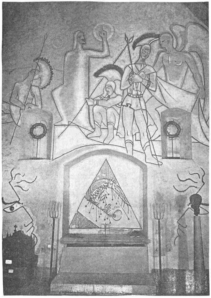 Au fond de l’autel, dans un triangle qui rappelle la Sainte-Trinité, remarquez le Christ aux épines. La tête penchée sur son bras, il souffre toutes les douleurs des hommes …