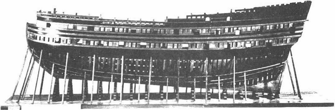 Des accores soutiennent de part et d’autre de la ligne de tins les parties inférieures de la coque et assurent l’équilibre transversal de la charpente en construction.