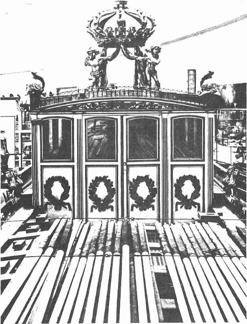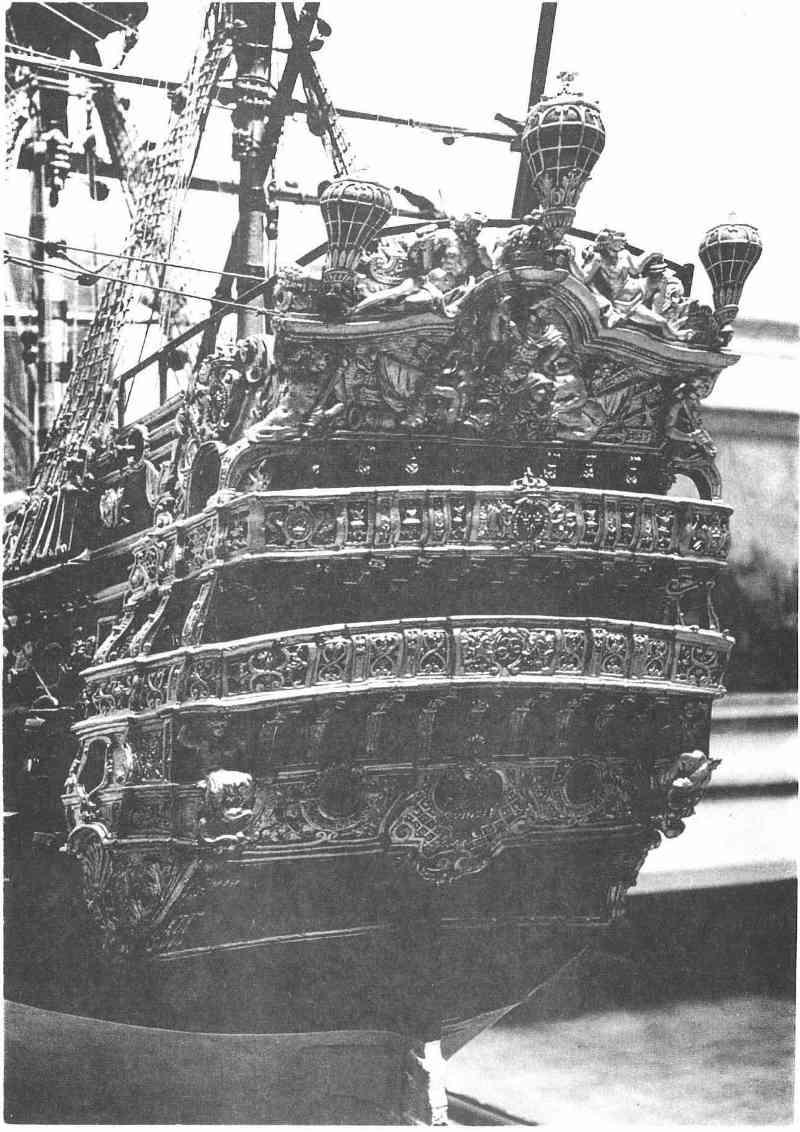 A la poupe du navire, des aménagements extérieurs à la coque, les bouteilles, des balcons et des ornements divers donnent au navire sa silhouette finale.