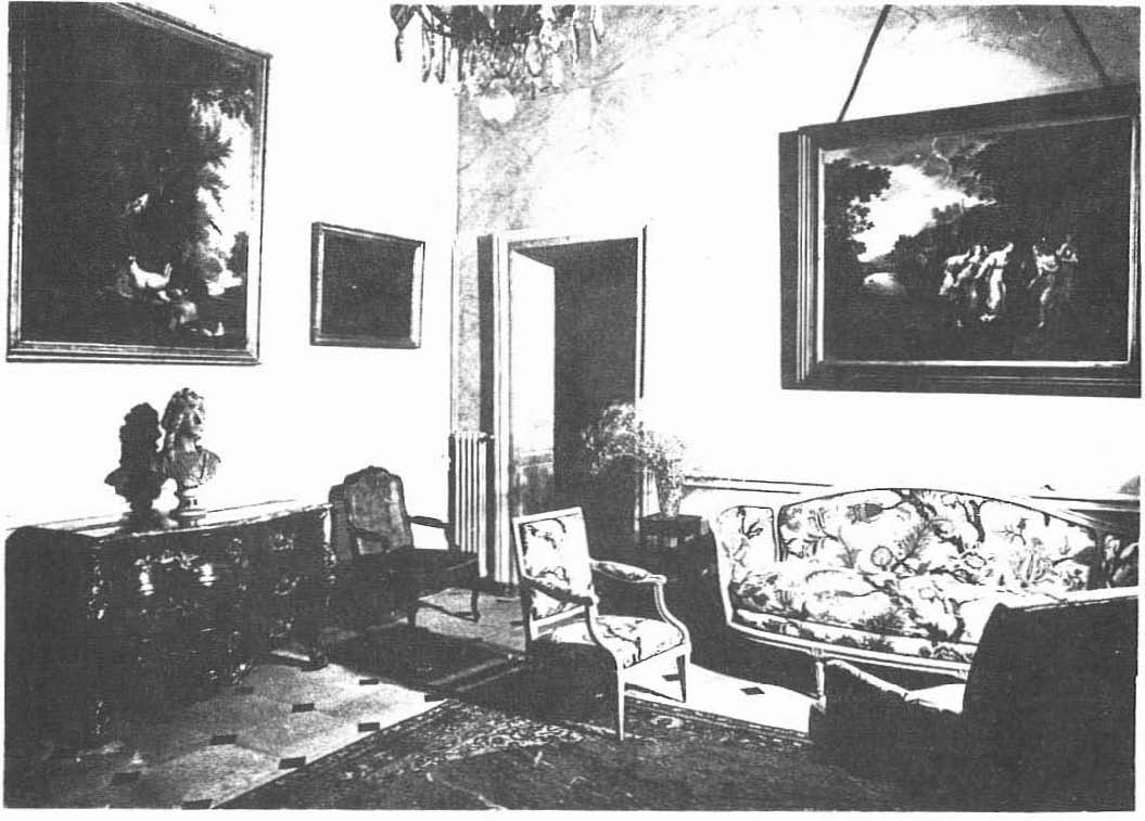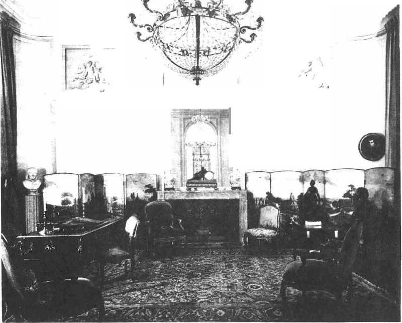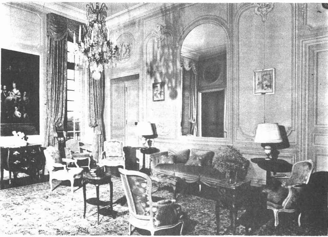 La pièce est meublée de façon confortable avec un mélange de meubles anciens et modernes. Devant la cheminée ornée d’une belle pendule-portique Louis XVI colonnes en marbre blanc, deux canapés modernes se font face auprès une table basse. Les sièges Louis XV en bois naturel sculpté sont recouverts d’une tapisserie décor de fleurs. A gauche de la porte on voit un très beau bureau cylindre Louis XVI en acajou pommelé et un fauteuil de bureau canné Louis XV portant l’estampille de C. Turcot. La table à jeux pliante, d’époque Louis XV, en marqueterie, longue et étroite, est signée de Migeon. Du côté des fenêtres, une commode Louis XV décorée d’une marqueterie de cubes est l’œuvre de Ch. Joseph Dufour.