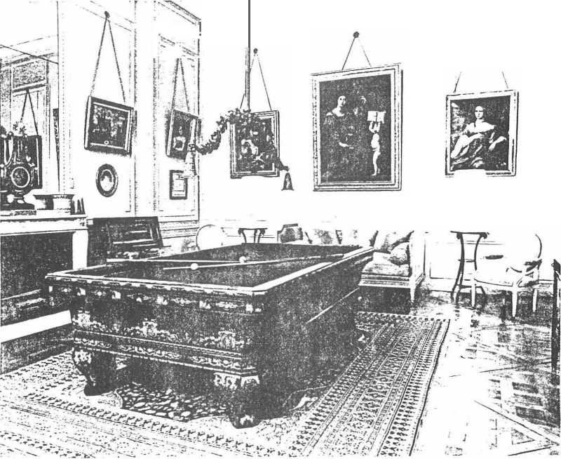 Nous pénétrons dans la salle de billard. Le billard est un meuble monumental, en palissandre marqué de citronnier, et porte la marque du fabricant Descayrac ainsi que la date 1839. Le boulier est du même type. Les sièges médaillon Louis XVI, de vastes proportions, sont recouverts en peau retournée fauve ; ils sont estampillés Pierre Bernard et proviennent de la bibliothèque du château de Vindé ainsi que les guéridons tripodes placés de chaque côté du canapé. L’importante commode Louis XVI en acajou était autrefois à Taverny. Elle supporte une garniture en porcelaine de Paris, d’époque Empire ; ce sont des coupes vanneries ajourées, soutenues par des cariatides en biscuit blanc et or. Le grand baromètre-thermomètre en forme de lyre de la fin du XVIIIe siècle posé sur la cheminée est également digne d’attention ; son mouvement est signé Chevallier (Photo 13).