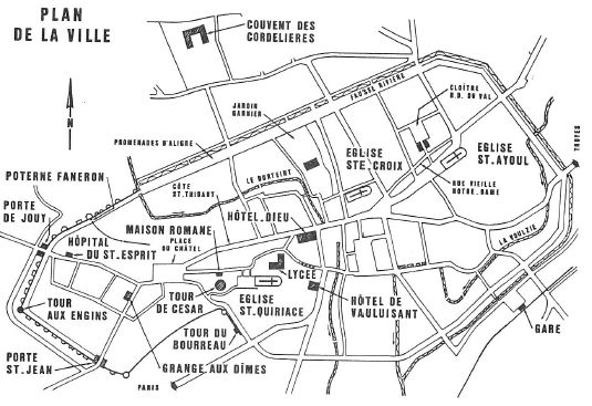 La ville basse d’origine monastique se développa dans un bas-fond, à partir du 11e s. autour d’un prieuré bénédictin fondé à l’endroit où les reliques de Saint-Ayoul (Aygulphe ou Aygulf), abbé de Lérins, avaient été miraculeusement retrouvées.