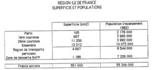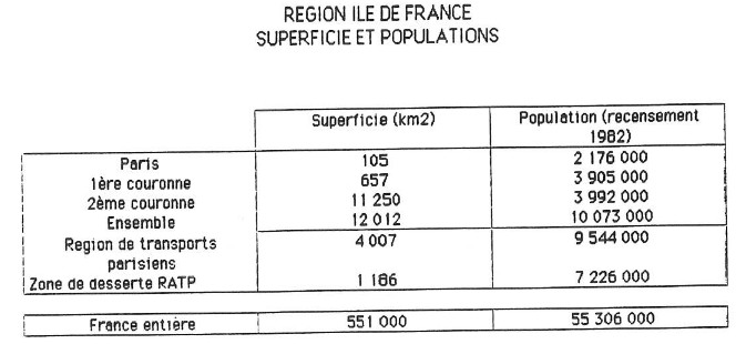 La région Ile de France compte 1/5 de la population de France pour une superficie de 12012 km2 (soit 1/50 de la surface). D’où les difficultés de transports dans cette région, accrus encore par le déséquilibre emploi-population.