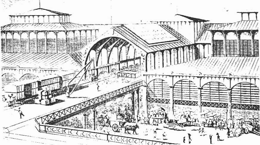 Les Halles centrales desservies par le viaduc du projet Heure (1878)