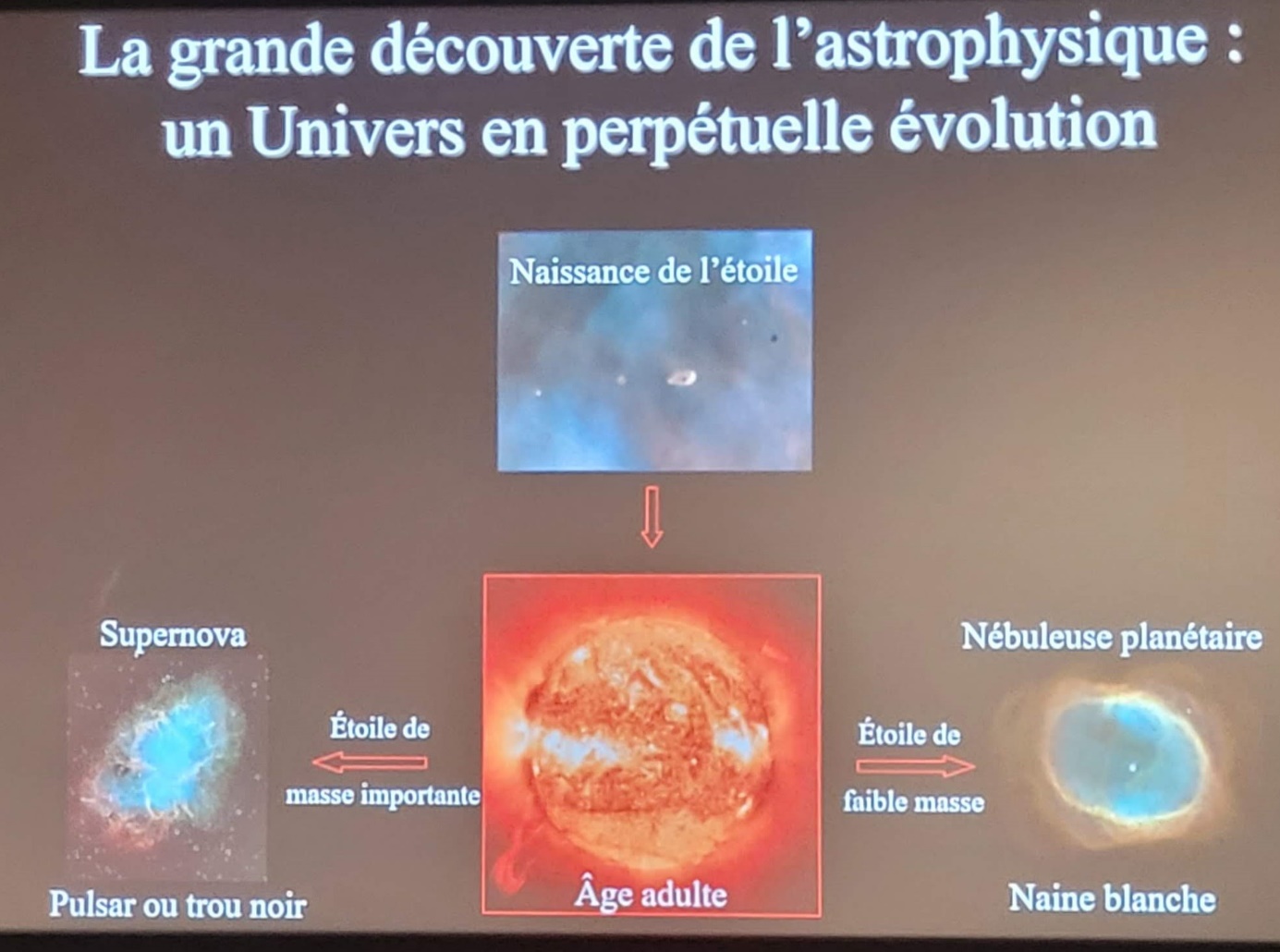 Grâce à l’analyse des spectres, on établit que 90% des étoiles se composent d’hydrogène, et que des réactions de fusions nucléaires ont lieu au cœur des étoiles. On constate également que l’univers est en perpétuelle évolution. En effet, une étoile nait, atteint l’âge adulte puis évolue en toute fin de vie soit en supernova (explosion d’étoile supermassive pour les étoiles supérieures 8 masses solaires), soit en nébuleuse planétaire (pour les étoiles ayant une masse comprise entre 0 ,5 et 8 masses solaires).