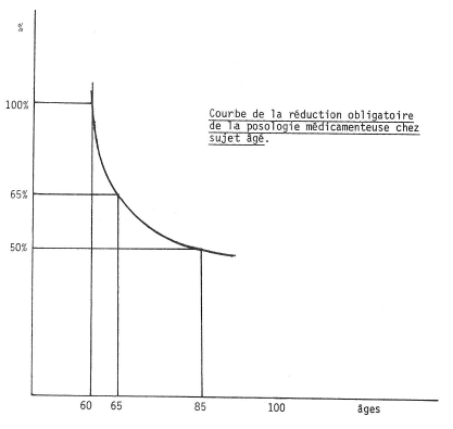 Jusqu’à 50 ans la dose normale prescrite peut être administrée. A partir de 60 ans jusqu’à 65 ans, on doit commencer à la diminuer. A 65 ans la dose à conseiller n’est plus que de 65%. A 85 ans, elle doit être réduite de moitié.