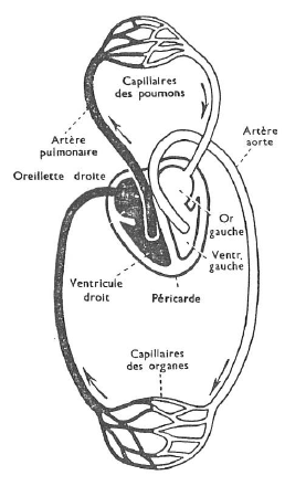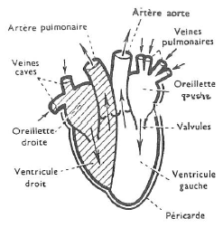Le cœur est un muscle creux qui joue le rôle d’une double pompe foulante à deux étages : les oreillettes, droite et gauche, chassent le sang dans les ventricules droit et gauche, le ventricule droit chasse le sang dans le circuit pulmonaire ou petite circulation, le ventricule gauche, dans la grande circulation.