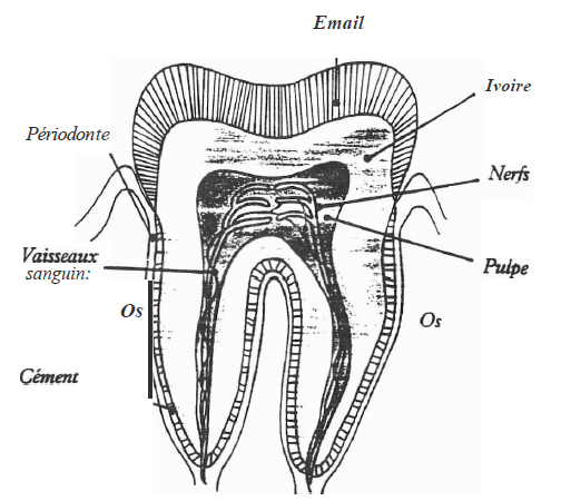 La dent est un organe d’origine épithéliale et conjonctive. Elle contient en son centre les nerfs, également d’origine épithéliale. Autour de la dent se trouvent la gencive et l’appareil ligamentaire qui la relie à l’os alvéolaire. L’ensemble des tissus de soutien qui relie la dent au maxillaire se nomme le parodonte. La dent fait partie d’une articulation.