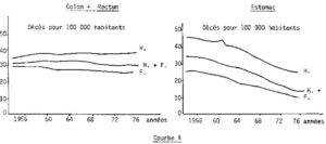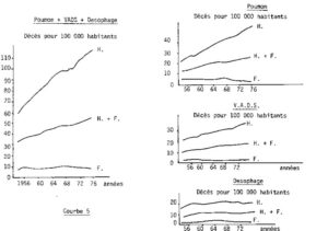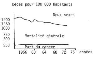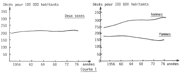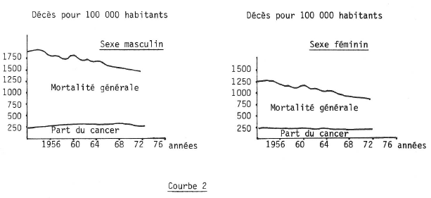 La courbe 1 indique le nombre de décès sur 100 000 habitants, dû au cancer de 1956 à 1976. On constate qu’il s’agit presque d’une horizontale. Pour la femme il y a une légère baisse et pour l’homme une légère montée.