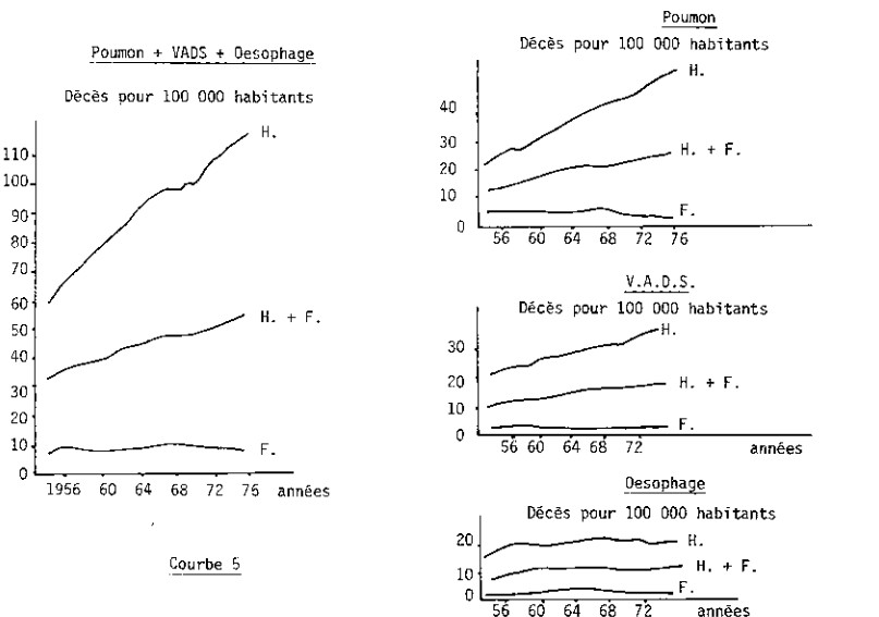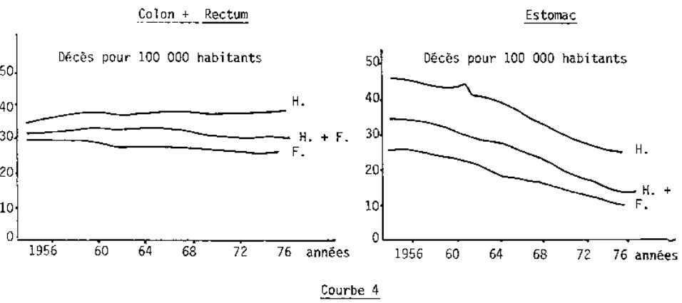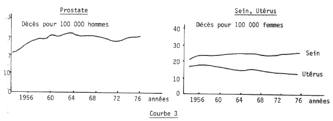 Les courbes 3, 4 nous montrent les décès pour 100 000 habitants dûs à différents cancers.