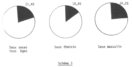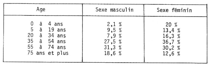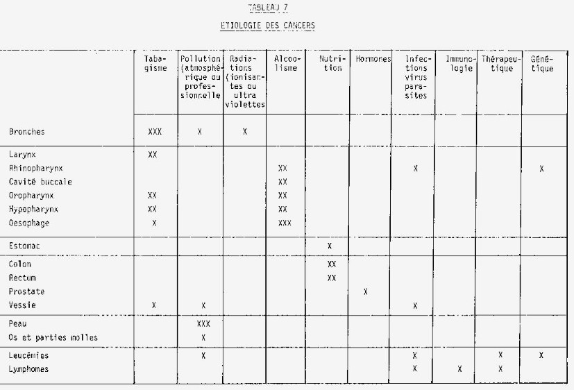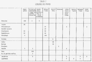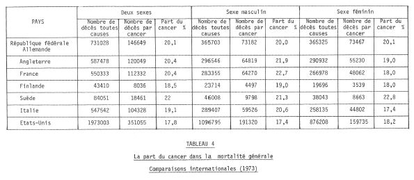 Le schéma 3 indique la part du cancer dans la mortalité générale, le tableau 2 la mortalité par cancer tous âges en 1976, le tableau 3 la mortalité par cancer suivant l’âge, le tableau 4 la part du cancer dans la mortalité générale, en comparaisons internationales.