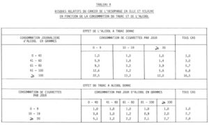 Certaines causes de déclenchement des cancers nous sont données sur le tableau 7 ainsi que les risques relatifs du cancer de l’œsophage en rapport avec l’usage du tabac et de l’alcool, tableau 8. Une personne fumant plus de 20 cigarettes par jour et buvant plus de 100 grammes d’alcool a 12 fois plus de risque d’avoir un cancer qu’une personne fumant moins de 10 cigarettes et buvant moins de 40 grammes d’alcool.